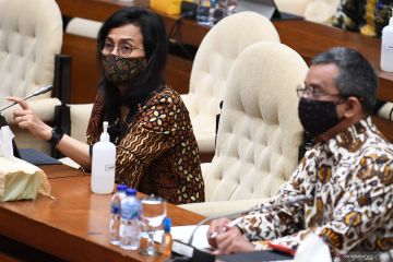 Menteri Keuangan Sri Mulyani (tengah) didampingi Wamenkeu Suahasil Nazara (kanan) mengikuti Rapat Kerja dengan Komisi XI DPR di Kompleks Parlemen Senayan, Jakarta, Rabu (26/8/2020). Raker tersebut membahas Laporan Keuangan Kementerian Keuangan pada APBN 2019. ANTARA FOTO/Puspa Perwitasari/hp.