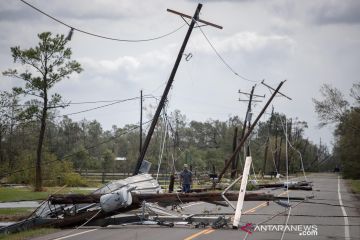 Warga melintasi jaringan listrik yang rusak usai diterjang badai tropis Laura di Sulphur, Louisiana, AS, Kamis (27/8/2020). ANTARA FOTO/REUTERS/Adrees Latif/foc.