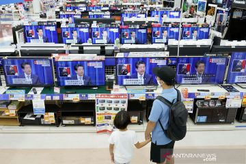 Layar televisi yang menyiarkan konferensi pers Perdana Menteri Jepang Shinzo Abe terlihat di toko listrik di Urayasu, timur Tokyo, Jepang 28 Agustus 2020, dalam foto yang diambil oleh Kyodo. Shinzo Abe secara resmi menyatakan mengundurkan diri sebagai PM Jepang karena alasan kesehatan. ANTARA FOTO/Kyodo via REUTERS/aww.