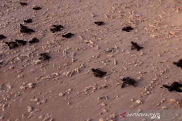 Tiga ekor tukik berjalan menuju ke laut ketika dilepasliarkan di pesisir Pantai Oesina Kabupaten Kupang, NTT, Jumat (28/08/2020). Balai Kawasan Konservasi Perairan Nasional (BKKPN) Kupang melapaskan 150 ekor tukik sebagai bagian dari penyelamatan satwa yang dilindungi. ANTARA FOTO/Kornelis Kaha/aww.