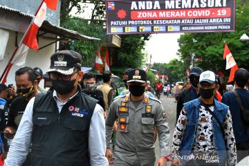 Wali Kota Bogor Bima Arya (kiri) mengunjungi wilayah zona merah penyebaran COVID-19 di GG Pacilong RW 04, Kelurahan Kebon Pedes, Tanah Sareal, Kota Bogor, Jawa Barat, Minggu (30/8/2020). Pemerintah Kota Bogor menerapkan Pembatasan Sosial Berskala Mikro dan Komunitas (PSBMK) termasuk pemberlakuan jam malam dan pembatasan aktivitas warga di 104 RW yang masuk zona merah penyebaran COVID-19 di Kota Bogor. ANTARA FOTO/Arif Firmansyah/aww.