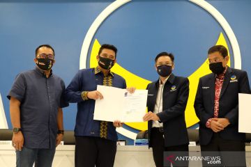 Bakal Calon Wali Kota dan Wakil Wali Kota Medan Bobby Nasution (kedua kiri), Aulia Rahman (kiri) menerima surat rekomendasi bakal calon Wali Kota dan Wakil Wali Kota yang diserahkan Ketua Ketua DPW Partai NasDem Sumut Iskandar (kedua kanan) disaksikan Ketua Dewan Pertimbangan NasDem Sumut T Erry Nuradi (kanan), di Medan, Sumatera Utara, Selasa (1/9/2020). Partai NasDem mengusung Bobby Nasution dan Aulia Rahman untuk maju pada Pilkada Kota Medan yang digelar pada 9 Desember 2020. ANTARA FOTO/Irsan Mulyadi/pras.