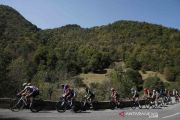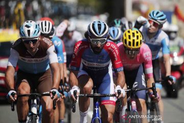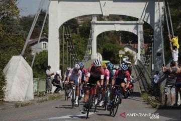 Pebalap sepeda memacu kecepatannya pada etape ke-8 Tour de France 2020 yang menempuh jarak 140 Km dari Cazeres ke Loudenvielle, Prancis, Sabtu (5/9/2020). ANTARA FOTO/REUTERS/Benoit Tessier/wsj.