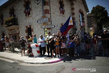 Para suporter menunggu melintasnya pebalap sepeda pada etape ke-8 Tour de France 2020 yang menempuh jarak 140 Km dari Cazeres ke Loudenvielle, Prancis, Sabtu (5/9/2020). ANTARA FOTO/REUTERS/Benoit Tessier/wsj.