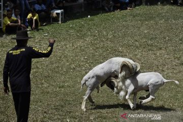 Dua domba beradu kepala saat kontes ternak di Kabupaten Garut, Jawa Barat, Minggu (6/9/2020). Selain pelestarian tradisi, laga adu domba tersebut juga sebagai ajang pencarian domba berkualitas untuk dijual dengan nilai tinggi. ANTARA FOTO/Candra Yanuarsyah/aww.