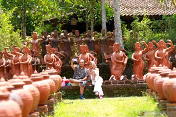 Wisatawan melihat patung penari gandrung di Terakota, Licin, Banyuwangi, Jawa Timur, Sabtu (12/9/2020). Wisata alam Taman Gandrung Terakota yang terletak di persawahan lereng gunung Ijen itu, menjadi alternatif tempat wisata luar ruangan untuk menghindari keramaian guna mencegah penyebaran wabah COVID-19. ANTARA FOTO/Budi Candra Setya/hp.