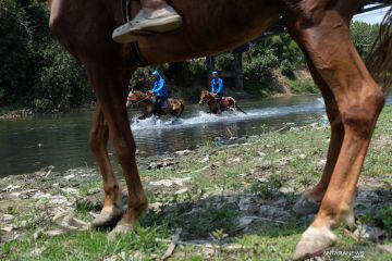 Anggota Komunitas Muslim Berkuda mengikuti latihan bersama saat deklarasi komunitas tersebut di kawasan Sungai Bengawan Solo, Kampung Semanggi, Pasar Kliwon, Solo, Jawa Tengah, Minggu (20/9/2020). Latihan tersebut digelar rutin untuk melatih kemampuan menunggang kuda, selain juga sebagai ajang silaturahmi dan dakwah bagi anggota komunitas. ANTARA FOTO/Maulana Surya/foc.