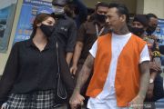Penabuh drum kelompok musik Superman is Dead I Gede Ari Astina alias Jerinx (kanan) didampingi istrinya Nora Alexandra (kiri) meninggalkan ruangan usai menjalani sidang secara daring di Polda Bali, Denpasar, Bali, Selasa (22/9/2020). Pengadilan Negeri Denpasar menyelenggarakan sidang kedua kasus dugaan ujaran kebencian dan pencemaran nama baik yang dilaporkan Ikatan Dokter Indonesia (IDI) Bali tersebut dengan agenda pembacaan dakwaan kembali setelah pada sidang perdana lalu terdakwa Jerinx beserta kuasa hukumnya melakukan aksi "walk out" atau keluar dari persidangan. ANTARA FOTO/Fikri Yusuf/wsj.