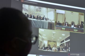 Petugas memantau pelaksanaan sidang lanjutan secara daring terhadap penabuh drum kelompok musik Superman is Dead I Gede Ari Astina alias Jerinx di Pengadilan Negeri Denpasar, Bali, Selasa (22/9/2020). Pengadilan Negeri Denpasar menyelenggarakan sidang kedua kasus dugaan ujaran kebencian dan pencemaran nama baik yang dilaporkan Ikatan Dokter Indonesia (IDI) Bali tersebut dengan agenda pembacaan dakwaan kembali setelah pada sidang perdana lalu terdakwa Jerinx beserta kuasa hukumnya melakukan aksi "walk out" atau keluar dari persidangan. ANTARA FOTO/Fikri Yusuf/wsj.