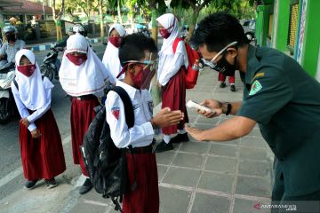 Guru memeriksa suhu tubuh siswa saat hari pertama Pembelajaran Tatap Muka (PTM) di SDN Lawangan Daya 2, Pamekasan, Jawa Timur, Rabu (23/9/2020). Pemkab Pamekasan mulai melakukan proses PTM untuk tingkat SD dan SMP sesuai dengan Keputusan Bersama (SKB) empat Menteri tentang Panduan Penyelenggaraan Pembelajaran, yang salah satunya harus masuk ke dalam zona kuning. ANTARA FOTO/Saiful Bahri/hp.