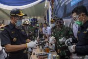 Kepala Kantor Wilayah Bea dan Cukai Sumatera bagian timur Dwijo Muryono (kiri) berbincang dengan Kepala Kantor Pengawasan dan Pelayanan Bea dan Cukai Tipe Madia Pabean B Palembang Abdul Harris (kanan) serta pejabat lainnya saat pemusnahan barang yang menjadi milik negara di Palembang, Sumatera Selatan, Rabu (23/9/2020). Kantor Wilayah Bea dan Cukai Sumatera bagian timur bersama Kantor Pengawasan dan Pelayanan Bea dan Cukai Type Madia Pabean B Palembang memusnahan 5.714.869 batang rokok ilegal, 330 botol minuman keras impor ilegal, 200.800gram tembakau iris, delapan buah airsoft gun, 125 buah sex toys, 10 buah dental equipment, 186 buah busur panah dan 432 buah karpet dengan total nilai sebesar Rp.2,8 miliar dengan potensi kerugian negara yang ditimbulkan sebesar Rp.2,7 miliar. ANTARA FOTO/Nova Wahyudi/hp.