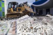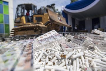 Petugas mengoperasikan alat berat untuk memusnakan barang yang menjadi milik negara di Palembang, Sumatera Selatan, Rabu (23/9/2020). Kantor Wilayah Bea dan Cukai Sumatera bagian timur bersama Kantor Pengawasan dan Pelayanan Bea dan Cukai Type Madia Pabean B Palembang memusnahan 5.714.869 batang rokok ilegal, 330 botol minuman keras impor ilegal, 200.800gram tembakau iris, delapan buah airsoft gun, 125 buah sex toys, 10 buah dental equipment, 186 buah busur panah dan 432 buah karpet dengan total nilai sebesar Rp.2,8 miliar dengan potensi kerugian negara yang ditimbulkan sebesar Rp.2,7 miliar. ANTARA FOTO/Nova Wahyudi/hp.