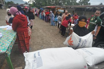 Sejumlah warga antre menerima bantuan beras di Nagari Kototangah Batu Hampa, Kabupaten Limapuluhkota, Sumatera Barat, Sabtu (26/9/2020). Warga dari Keluarga Penerima Manfaat (KPM) Program Keluarga Harapan (PKH) menerima bantuan beras masing-masing sebanyak 45 kilogram untuk tiga bulan (15 kilogram/bulan) dalam rangka program Jaring Pengaman Sosial (JPS) penanganan dampak COVID-19. ANTARA/Iggoy el Fitra/hp.