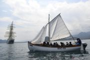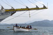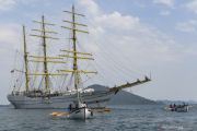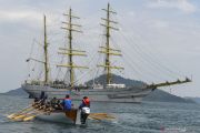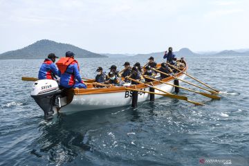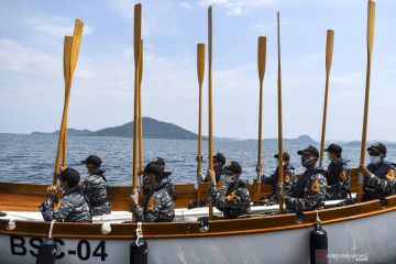 Sejumlah Taruna-Taruni AAL tingkat III angkatan ke-67 mengangkat dayung di atas sekoci layar di perairan Teluk Ratai, Lampung, Kamis (1/10/2020). Kegiatan tersebut sebagai bentuk pengenalan pada Taruna-Taruni dalam mengetahui arah angin untuk mengembangkan layar. ANTARA FOTO/M Risyal Hidayat/hp.