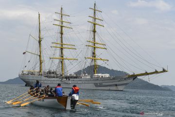 Prajurit KRI Bima Suci memberikan arahan pada Taruna-Taruni AAL tingkat III angkatan ke-67 saat mendayung menggunakan sekoci layar di perairan Teluk Ratai, Lampung, Kamis (1/10/2020). Kegiatan tersebut sebagai bentuk pengenalan pada Taruna-Taruni dalam mengetahui arah angin untuk mengembangkan layar. ANTARA FOTO/M Risyal Hidayat/hp.