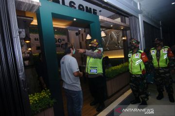 Personel TNI/Polri memberikan imbauan kepada pemilik kafe saat razia penutupan tempat hiburan malam dan kafe di Tegal, Jawa Tengah, Kamis (1/10/2020) malam. Pemerintah Kota Tegal menutup seluruh tempat hiburan malam, kafe dan tempat wisata mulai 1 Oktober hingga 30 Oktober mendatang, menyusul meningkatnya kasus positif COVID-19 di Kota Tegal. ANTARA FOTO/Oky Lukmansyah/aww.