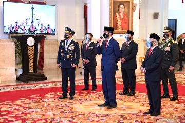 Presiden Joko Widodo memberi hormat ketika memimpin upacara HUT ke-75 TNI di Istana Negara Jakarta, Senin (5/10/2020). Pada peringatan HUT ke-75 TNI, Presiden Joko Widodo mendukung transformasi organisasi TNI harus selalu dilakukan dengan dinamika lingkungan strategis sesuai dengan dinamika ancaman dan perkembangan teknologi militer. ANTARA FOTO/Biro Pers/Kris/handout/wpa/hp.