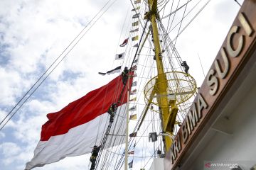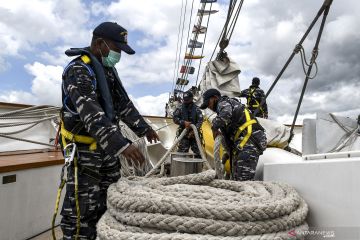 Sejumlah prajurit TNI AL awak KRI Bima Suci menarik tali-tali saat akan tolak dari Dermaga Pangkalan TNI AL (Lanal) Caligi, Pesawangan, Lampung, Selasa (6/10/2020). KRI Bima Suci akan melanjutkan pelayaran rute kedua menuju Padang dalam mendukung Taruna-Taruni AAL tingkat III angkatan ke-67 mengikuti latihan praktek (lattek) Kartika Jala Krida (KJK) 2020. ANTARA FOTO/M Risyal Hidayat/wsj.