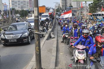 Sejumlah buruh dari berbagai aliansi menggelar aksi dorong motor di Jalan raya Cikarang-Cibarusah, Kabupaten Bekasi, Jawa Barat, Selasa (6/10/2020). Aksi tersebut sebagai kekecewaan buruh atas pengesahan Undang-Undang Cipta Kerja oleh DPR. ANTARA FOTO/ Fakhri Hermansyah/pras.