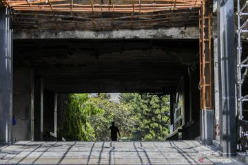 Pekerja melintas di gedung utama Kejaksaan Agung di Jakarta, Rabu (7/10/2020). Kejaksaan Agung mulai melakukan perbaikan gedung utama yang mengalami kebakaran pada 22 Agustus lalu dengan anggaran Rp350 miliar. ANTARA FOTO/Galih Pradipta/wsj.