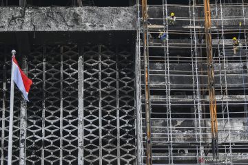 Pekerja memasang steger untuk merenovasi gedung utama Kejaksaan Agung di Jakarta, Rabu (7/10/2020). Kejaksaan Agung mulai melakukan perbaikan gedung utama yang mengalami kebakaran pada 22 Agustus lalu dengan anggaran Rp350 miliar. ANTARA FOTO/Galih Pradipta/wsj.