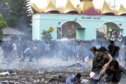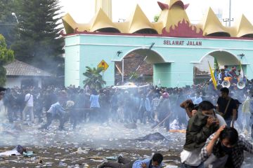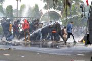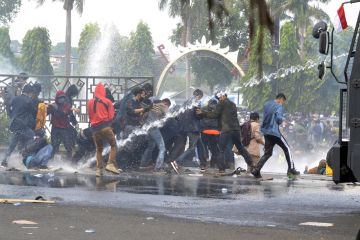 Sejumlah Mahasiswa berhamburan saat bentrok dengan pihak Kepolisian pada aksi demonstrasi di lingkungan kantor Pemerintah Provinsi Lampung, Lampung, Rabu (7/10/2020). Aksi tersebut sebagai penolakan UU Cipta Kerja yang telah disahkan oleh DPR. ANTARA FOTO/Ardiansyah/wsj.