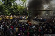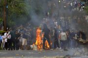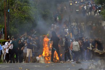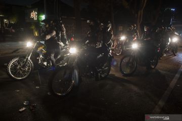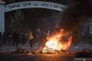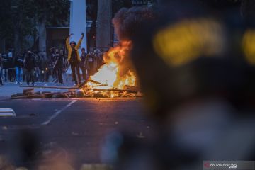 Massa membakar motor saat bentrok dengan pihak Kepolisian pada aksi demonstrasi di lingkungan kantor Pemerintah Provinsi Lampung, Lampung, Rabu (7/10/2020). Aksi tersebut sebagai penolakan UU Cipta Kerja yang telah disahkan oleh DPR. ANTARA FOTO/Ardiansyah/wsj.
