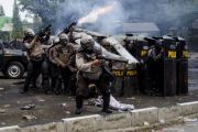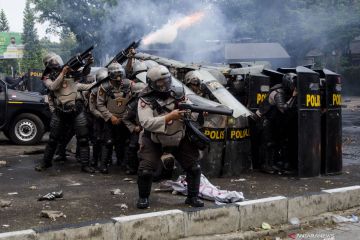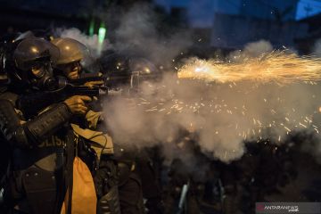 Personel kepolisian menembakkan gas air mata saat unjuk rasa tolak Undang-Undang Cipta Kerja di depan Gedung DPRD Jawa Barat, Bandung, Jawa Barat, Rabu (7/10/2020). Aksi yang menolak dan menuntut pembuatan Perppu untuk Undang-Undang Cipta Kerja tersebut berakhir ricuh. ANTARA FOTO/Novrian Arbi/wsj.