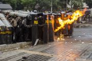Personel kepolisian menahan lemparan molotov oleh demonstran saat unjuk rasa tolak Undang-Undang Cipta Kerja di depan Gedung DPRD Jawa Barat, Bandung, Jawa Barat, Rabu (7/10/2020). Aksi yang menolak dan menuntut pembuatan Perppu untuk Undang-Undang Cipta Kerja tersebut berakhir ricuh. ANTARA FOTO/Novrian Arbi/wsj.