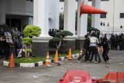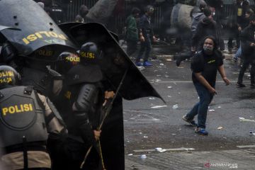Demonstran menyerang personel kepolisian saat unjuk rasa tolak Undang-Undang Cipta Kerja di depan Gedung DPRD Jawa Barat, Bandung, Jawa Barat, Rabu (7/10/2020). Aksi yang menolak dan menuntut pembuatan Perppu untuk Undang-Undang Cipta Kerja tersebut berakhir ricuh. ANTARA FOTO/Novrian Arbi/wsj.