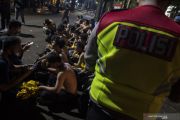 Petugas mengamankan massa aksi tolak UU Omnibus Law Cipta Kerja di kawasan Palmerah, Jakarta, Rabu (7/10/2020). ANTARA FOTO/Galih Pradipta/wsj.