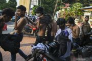 Demonstran menahan temannya yang berusaha menyerang personel kepolisian saat unjuk rasa tolak Undang-Undang Cipta Kerja di depan Gedung DPRD Jawa Barat, Bandung, Jawa Barat, Rabu (7/10/2020). Aksi yang menolak dan menuntut pembuatan Perppu untuk Undang-Undang Cipta Kerja tersebut berakhir ricuh. ANTARA FOTO/Novrian Arbi/wsj.