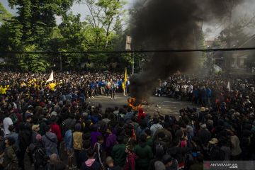Mahasiswa melakukan aksi unjuk rasa tolak Undang-Undang Cipta Kerja di depan Gedung DPRD Jawa Barat, Bandung, Jawa Barat, Rabu (7/10/2020). Mereka dalam aksinya menuntut DPR dan Pemerintah untuk membuat Perppu pengganti untuk mencabut Undang-Undang Omnibus Law Cipta Kerja. ANTARA FOTO/Novrian Arbi/wsj.