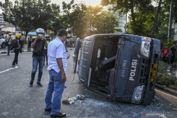Petugas menyaksikan mobil polisi yang rusak usai bentrokan antara massa aksi tolak UU Omnibus Law Cipta Kerja dengan polisi di kawasan Penjernihan, Jakarta, Rabu (7/10/2020). ANTARA FOTO/Galih Pradipta/foc.ANTARA FOTO/GALIH PRADIPTA (ANTARA FOTO/GALIH PRADIPTA)