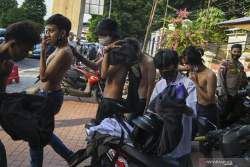 Petugas kepolisian mengidentifikasi demonstran saat unjuk rasa di Bandung, Jawa Barat, Rabu (7/10/2020). Unjuk rasa menolak UU Cipta Kerja tersebut berakhir ricuh. ANTARA FOTO/M Agung Rajasa/wsj.