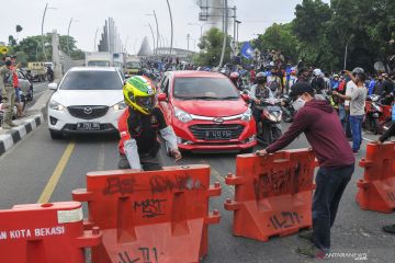 Sejumlah mobil terjebak kemacetan saat ada pemblokiran dari massa aksi di Jalan Jendral Ahmad Yanii, Bekasi, Jawa Barat, Kamis (8/10/2020). Aksi blokir jalan tersebut sebagai bentuk penolakan terhadap RUU Cipta Kerja yang disahkan oleh DPR. ANTARA FOTO/ Fakhri Hermansyah/foc.