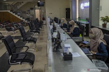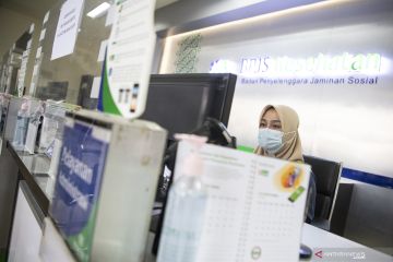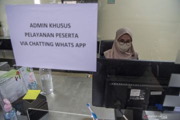Petugas melayani peserta BPJS Kesehatan dengan tanpa tatap muka di Kantor BPJS Kesehatan kantor cabang Palembang, Sumatera Selatan, Kamis (8/10/2020). BPJS Kesehatan melakukan inovasi pelayanan tanpa tatap muka dengan program Pelayanan Administrasi Melalui Whatsapp (Pandawa) untuk mencegah penyebaran COVID-19 dan mempermudah pelayanan bagi peserta. ANTARA FOTO/Nova Wahyudi/hp.