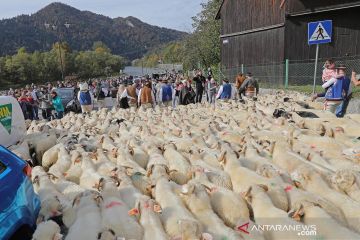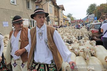 Penggembala berjalan bersama ratusan domba saat mengikuti pawai Redyk di kota Pegunungan Tatra, Szczawnica, Polandia, Sabtu (10/10/20). Redyk adalah pawai tradisional para penggembala domba yang berlangsung dua kali setahun yaitu pada musim semi sebagai awal dari musim penggembalaan dan musim gugur pada akhir musim penggembalaan. ANTARA FOTO/Mark Podmokly/Agencja Gazeta/via REUTERS/pras.