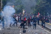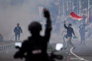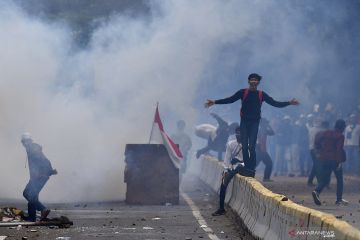 Massa aksi penolak UU Cipta Kerja melempar batu ke arah polisi di Kwitang, Jakarta Pusat, Selasa (13/10/2020). ANTARA FOTO/Sigid Kurniawan/hp.
