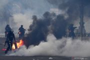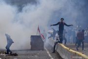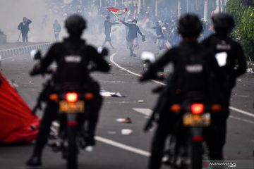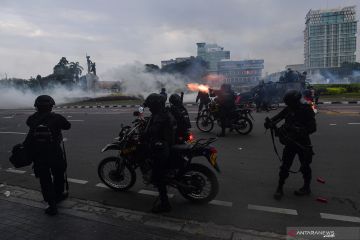 Anggota Brimob Polri menembakan gas air mata ke arah massa aksi penolak UU Cipta Kerja di Tugu Tani, Jakarta Pusat, Selasa (13/10/2020). ANTARA FOTO/Sigid Kurniawan/