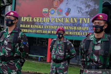 Prajurit TNI AL mengikuti Apel Gelar Pasukan TNI di Lapangan Benteng, Medan, Sumatera Utara, Rabu (14/10/2020). Apel gelar pasukan yang diikuti prajurit TNI AD, TNI AU dan TNI AL tersebut guna membantu personel kepolisian dalam menciptakan suasana aman dan kondusif di wilayah Sumatera Utara. ANTARA FOTO/Irsan Mulyadi/Lmo/hp.