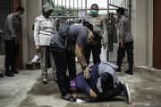 Petugas kepolisian mendata peserta aksi sebelum dipulangkan di Polda Metro Jaya, Jakarta, Rabu (14/10/2020). Polda Metro Jaya memulangkan ratusan peserta aksi yang diamankan dalam aksi unjuk rasa menolak UU Cipta Kerja. ANTARA FOTO/Aprillio Akbar/hp.