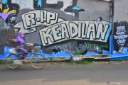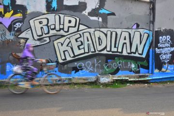 Warga melintas di depan mural bertuliskan "Rip KeadilanÓ, di Jalan Veteran, Kota, Kudus, Jawa Tengah, Kamis (15/10/2020). Mural tersebut sebagai bentuk kritik dan penolakan atas disahkannya Omnibus Law UU Cipta Kerja oleh Dewan Perwakilan Rakyat (DPR). ANTARA FOTO/Yusf Nugroho/hp.
