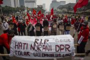 Massa aksi yang tergabung dalam Serikat Rakyat Miskin Indonesia (SMRI) melakukan aksi teatrikal saat berunjuk rasa menolak Undang-Undang Cipta Kerja di kawasan Jalan Merdeka Barat, Jakarta, Jumat (16/10/2020). ANTARA FOTO/Dhemas Reviyanto/foc.