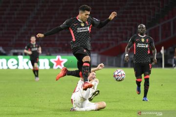 Pesepak bola Liverpool Roberto Firmino (kiri) berebut bola dengan pesepak bola Ajax Perr Schuurs (bawah) dalam laga Group D Liga Campions, di Stadion Johan Cruijff Arena, Amsterdam, Belanda, Rabu (21/10/2020). LIverpool berhasil mengalahkan Ajax dengan skor tipis 1-0. ANTARA FOTO/Reuters-Piroschka Van De Wouw/hp.