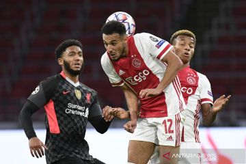 Pesepak bola Liverpool Joe Gomez (kiri) berebut bola dengan pesepak bola Ajax Noussair Mazraoui (tengah) dalam laga Group D Liga Campions, di Stadion Johan Cruijff Arena, Amsterdam, Belanda, Rabu (21/10/2020). LIverpool berhasil mengalahkan Ajax dengan skor tipis 1-0. ANTARA FOTO/Reuters-Piroschka Van De Wouw/hp.