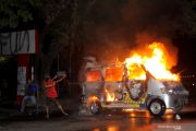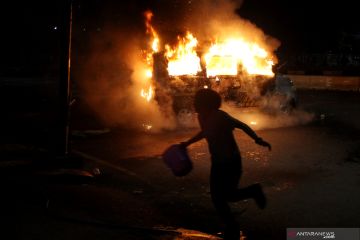 Warga menyiramkan air pada mobil ambulans yang dibakar pengunjuk rasa dalam aksi menolak UU Cipta Kerja di depan kampus Universitas Negeri Makassar (UNM), Makassar, Sulawesi Selatan, Kamis (22/10/2020). Aksi tersebut berakhir ricuh dan sejumlah kendaraan dibakar serta kantor Parta Nasdem dirusak. ANTARA FOTO/Abriawan Abhe/foc.