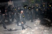 Polisi berusaha membubarkan aksi menolak UU Cipta Kerja di depan kampus Universitas Negeri Makassar (UNM), Makassar, Sulawesi Selatan, Kamis (22/10/2020). Aksi tersebut berakhir ricuh dan sejumlah kendaraan dibakar serta kantor Parta Nasdem dirusak. ANTARA FOTO/Abriawan Abhe/foc.