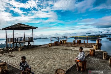 Dua orang pengunjung menikmati pemandangan di puncak The Heaven Ifar Gunung, Kabupaten Jayapura, Papua, Sabtu (24/10/20). Destinasi wisata The Heaven berada di Ifar Gunung lingkungan Resimen Induk Daerah Militer (Rindam) XVII Cenderawasih dengan ketinggian 325 meter diatas permukaan laut, menjadi pilihan masyarakat untuk menikmati panorama serta keindahan pemandangan Danau Sentani, Bandara Dortheys Hiyo Eluay bahkan pusat Kota Sentani, Kabupaten Jayapura. ANTARA FOTO/Indrayadi TH/hp.