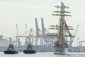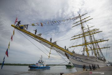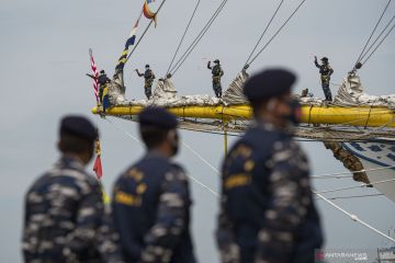 Sejumlah Taruna AAL tingkat III angkatan ke-67 mengikuti parade roll di atas KRI Bima Suci-945 saat tiba di Pelabuhan Belawan, Medan, Sumatera Utara, Sabtu (24/10/2020). KRI Bima Suci-945 yang merupakan kapal layar latih bagi taruna/kadet aal itu bersandar selama tiga hari di Medan untuk melaksanakan sejumlah kegiatan dalam mendukung latihan praktek (Lattek) Kartika Jala Krida (KJK) 2020. ANTARA FOTO/Aditya Pradana Putra/hp.